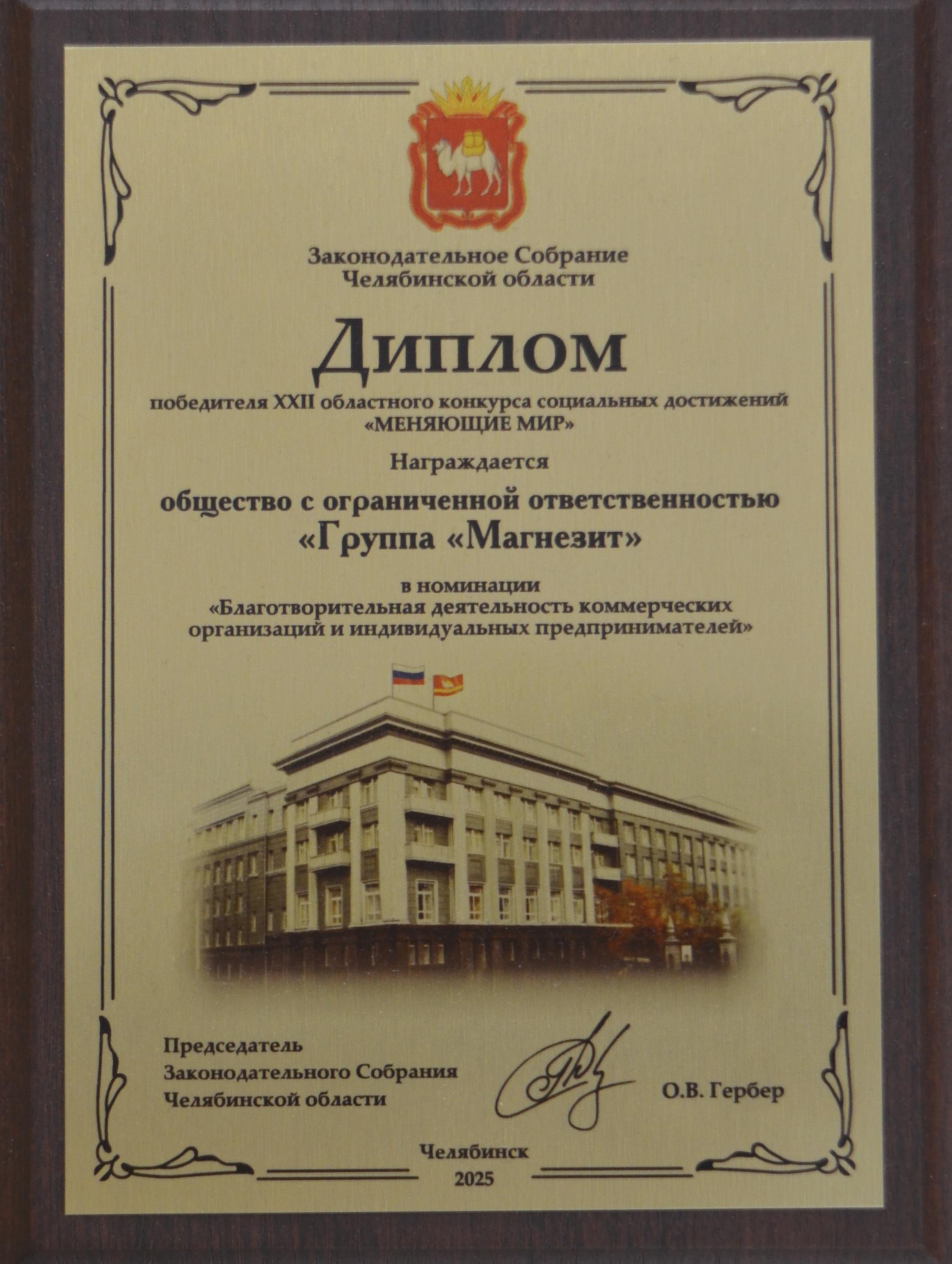 Группа Магнезит – постоянный участник конкурса социальных достижений и благотворительных инициатив «Меняющие мир». Деятельность компании из года в год эксперты конкурса высоко оценивают за поддержку значимых проектов в различных сферах общественной жизни: культура и преобразование городской среды, всестороннее развитие детей и юношества, развитие молодёжного движения, возрождение духовных традиций, социальная поддержка граждан и развитие краеведения, а также помощь участникам СВО и их семьям.