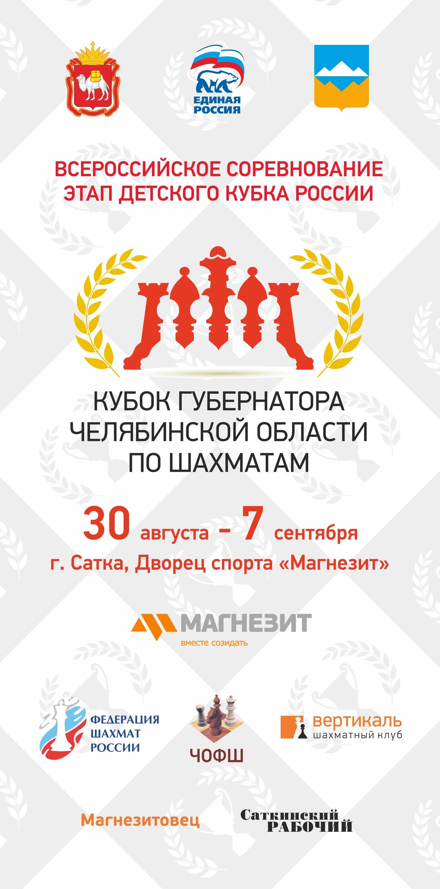 С 27 августа по 7 сентября Сатка вновь станет площадкой проведения масштабных соревнований. Большой шахматный фестиваль объединит несколько состязаний для взрослых и маленьких любителей логических черно-белых композиций. Главное из них — XIII детский турнир на Кубок губернатора Челябинской области, этап детского Кубка России. В эти же дни будет проводиться ряд других мероприятий, в том числе традиционная «Саткинская осень» — этап Кубка России по шахматам среди женщин, а также новое событие — Кубок Группы Магнезит.